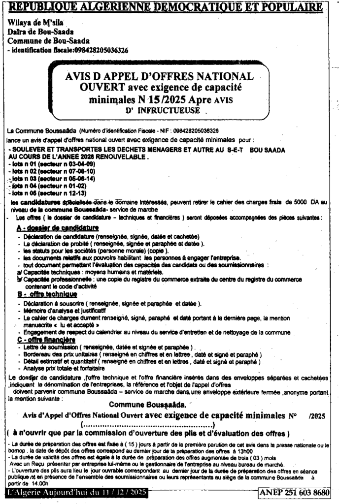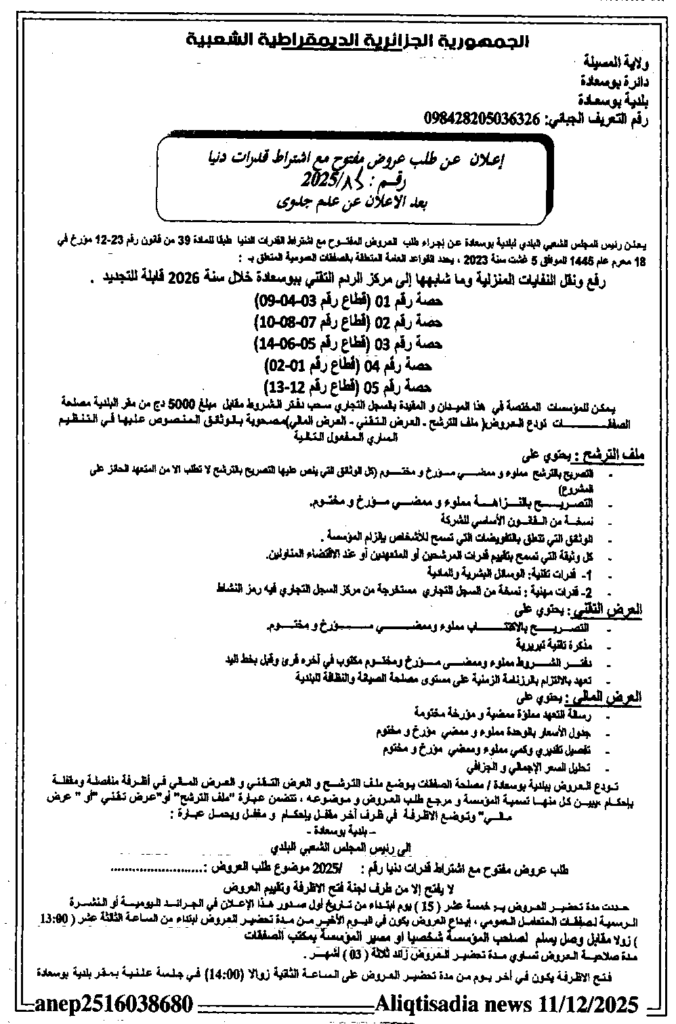 إعلان عن طلب عروض مفتوح 2025/15 بعد الاعلان عن عدم جدوى/ بلدية أولاد دراج