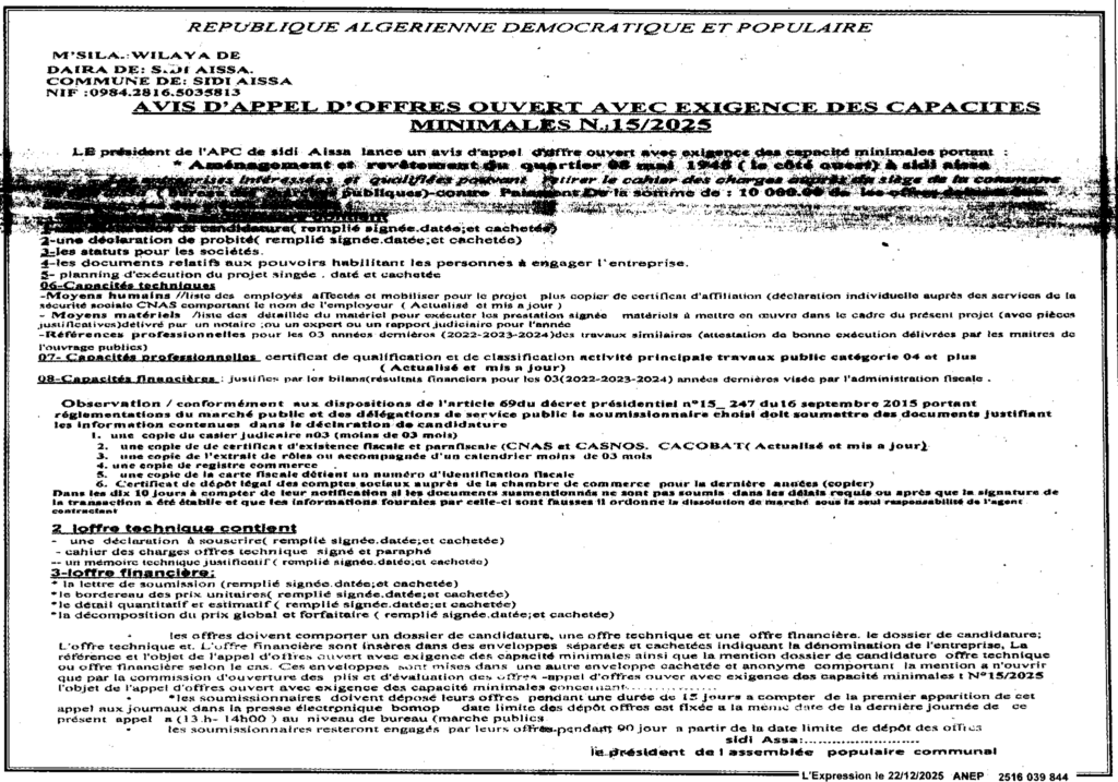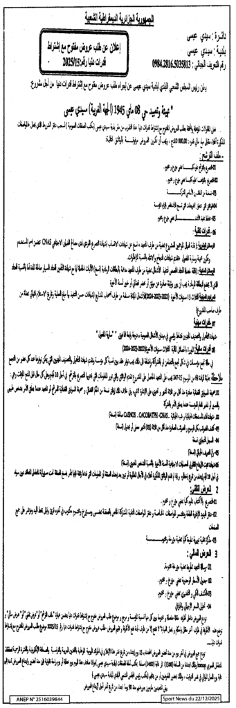 إعلان عن طلب عروض مفتوح 2025/15 بلدية سيدي عيسى
