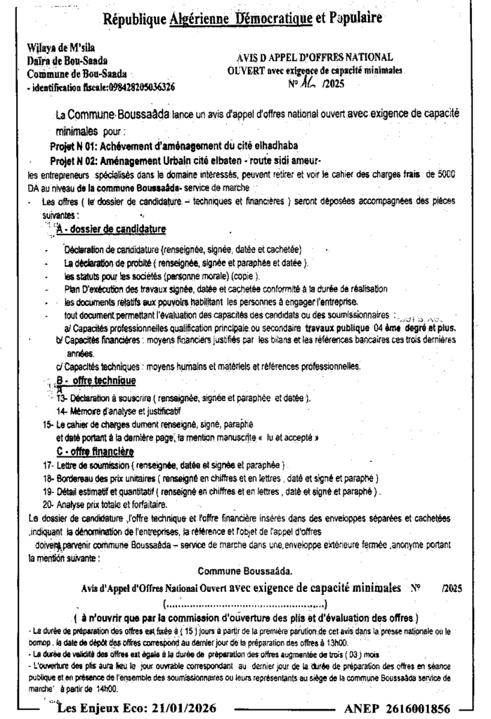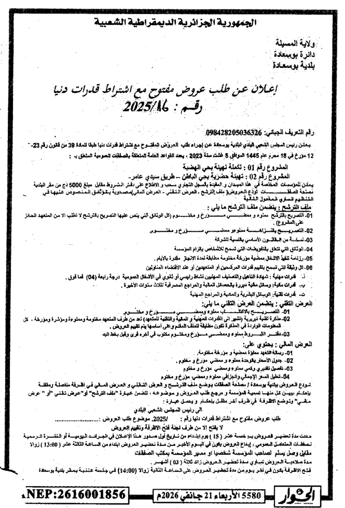 إعلان عن طلب عروض مفتوح 2025/16/ بلدية بوسعادة