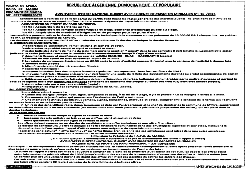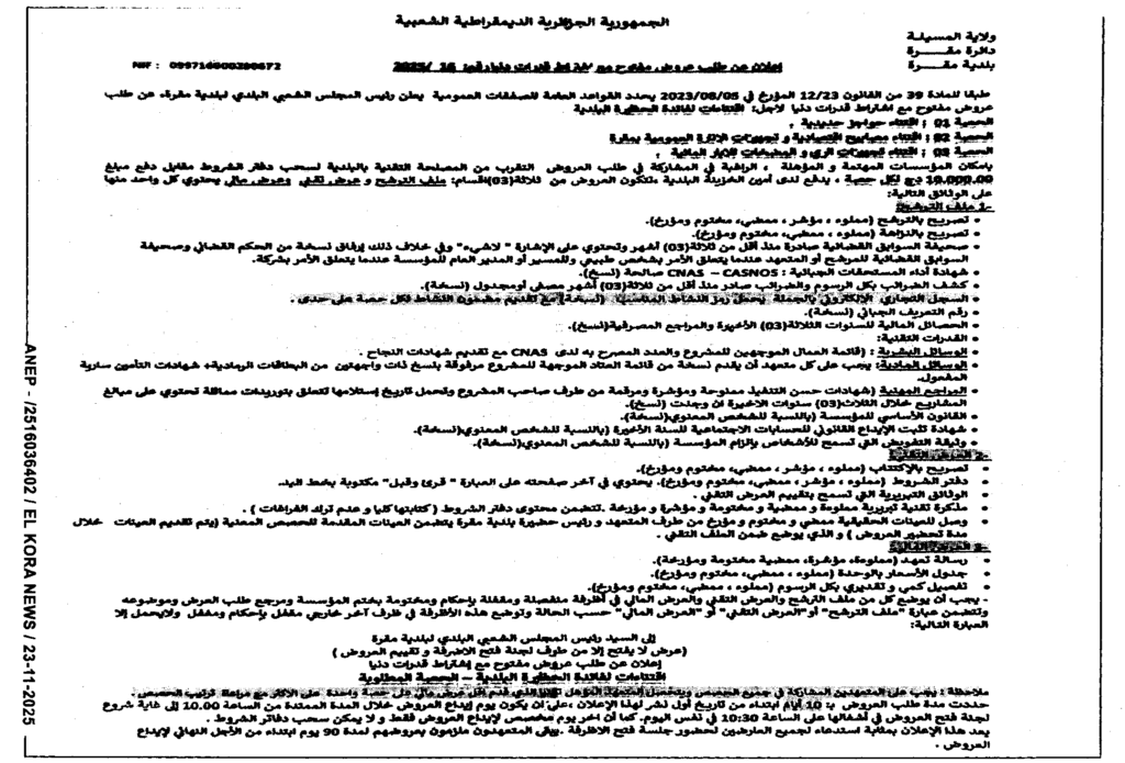 إعلان عن طلب عروض مفتوح 2025/16 بلدية مقرة