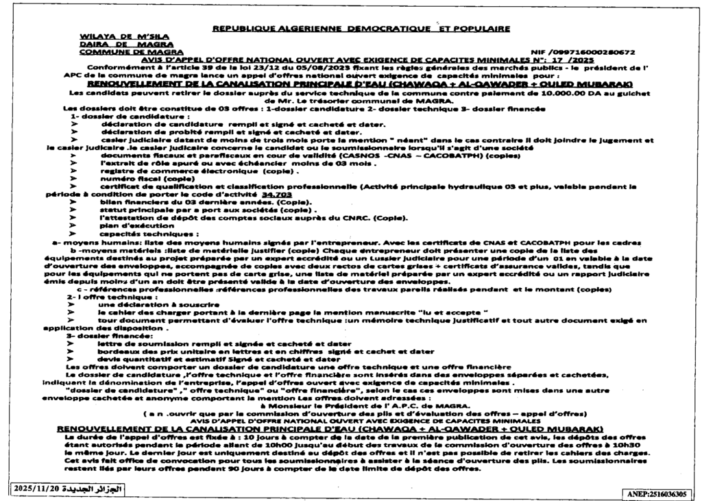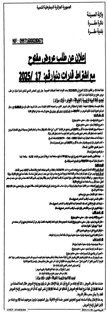 إعلان عن طلب عروض مفتوح 2025/17 بلدية مقرة