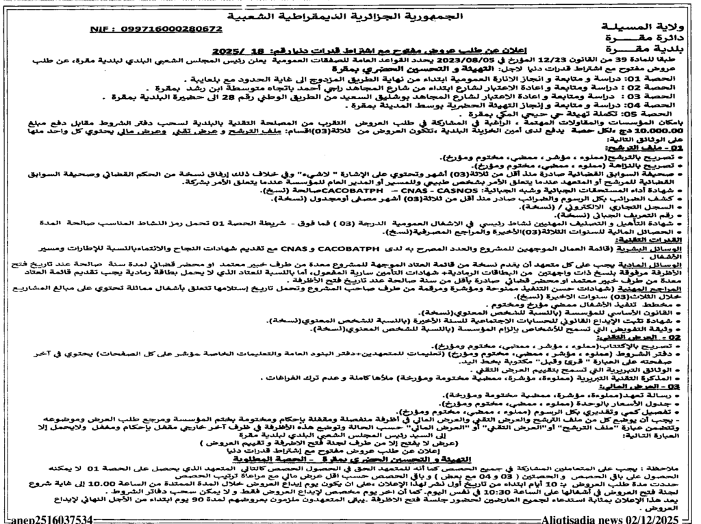 إعلان عن طلب عروض مفتوح 2025/18 بلدية مقرة