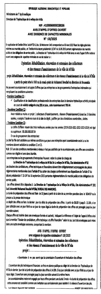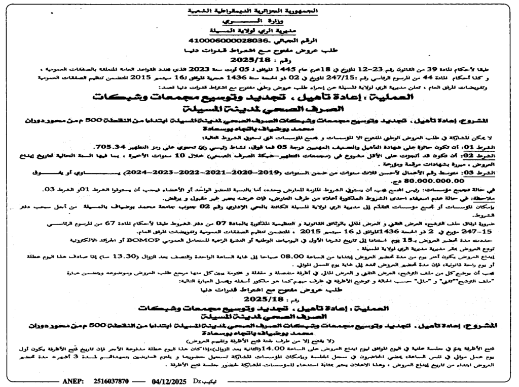 إعلان عن طلب عروض مفتوح 2025/18 مديرية الري لولاية المسيلة