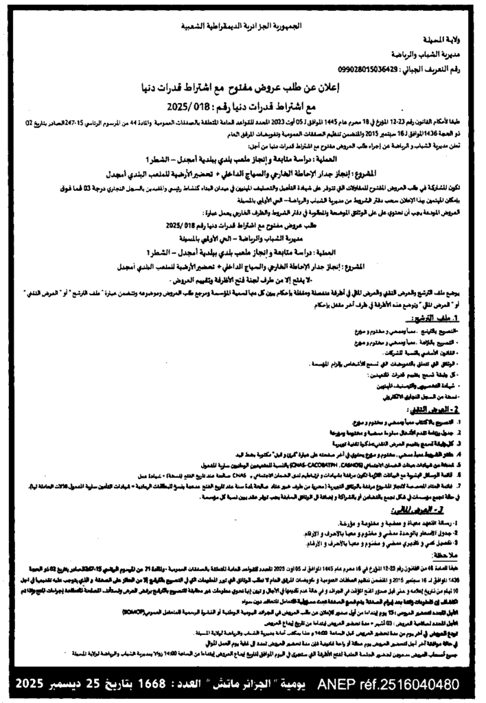 إعلان عن طلب عروض مفتوح 2025/18 مديرية الشباب والرياضة لولاية المسيلة
