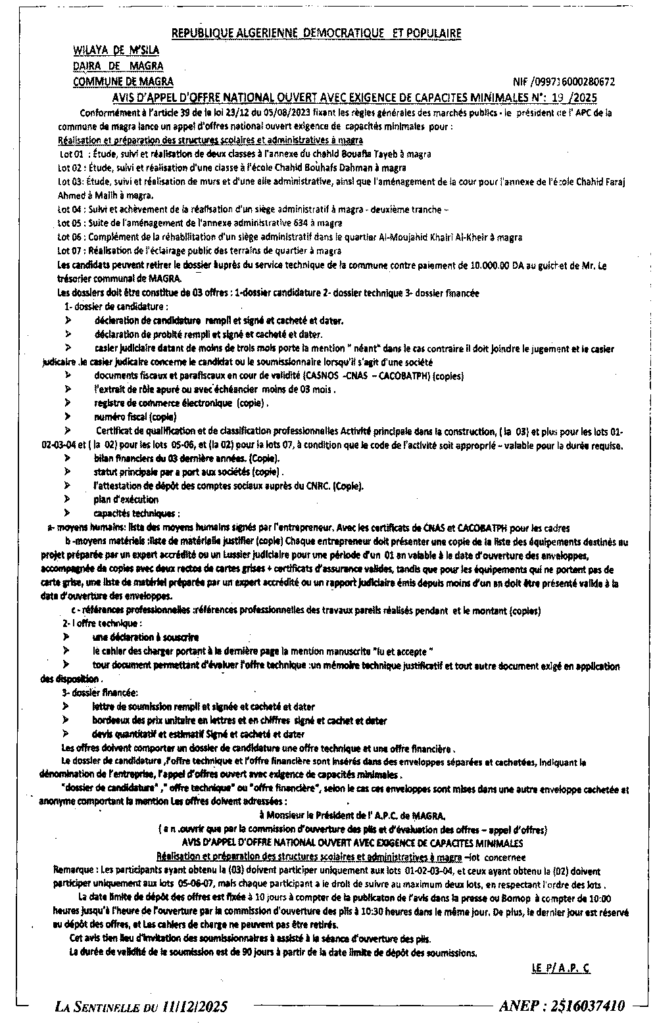 إعلان عن طلب عروض مفتوح 2025/19 بلدية مقرة