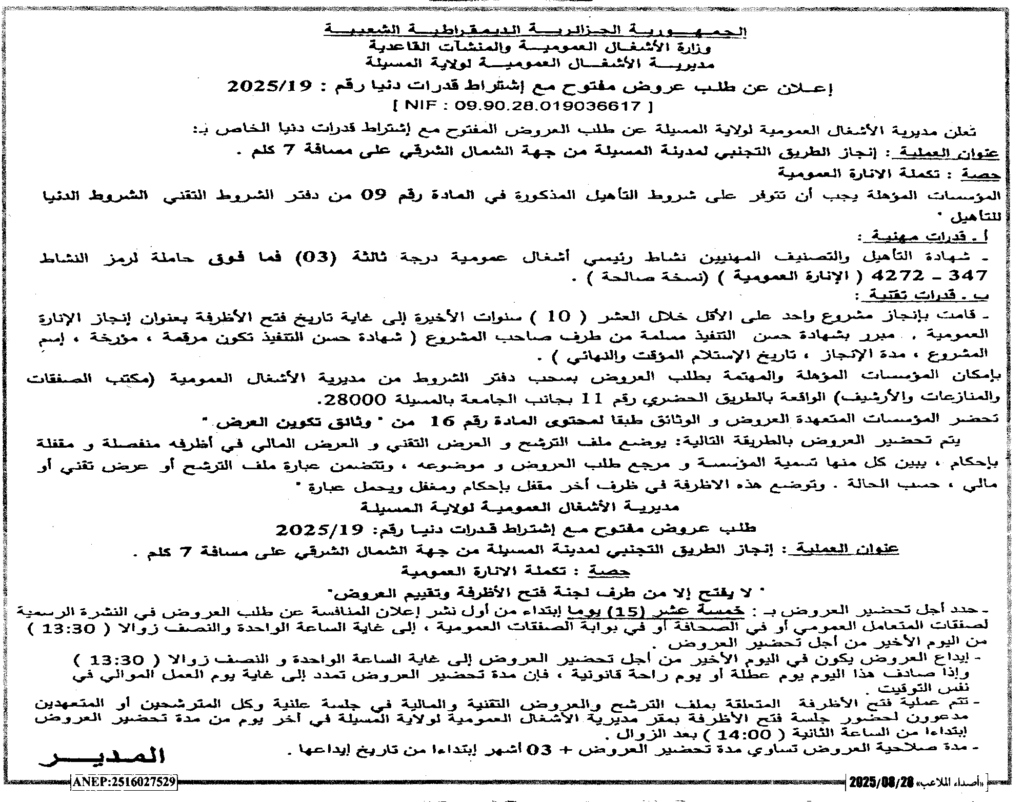 إعلان عن طلب عروض مفتوح 2025/19 مديرية الأشغال العمومية لولاية المسيلة