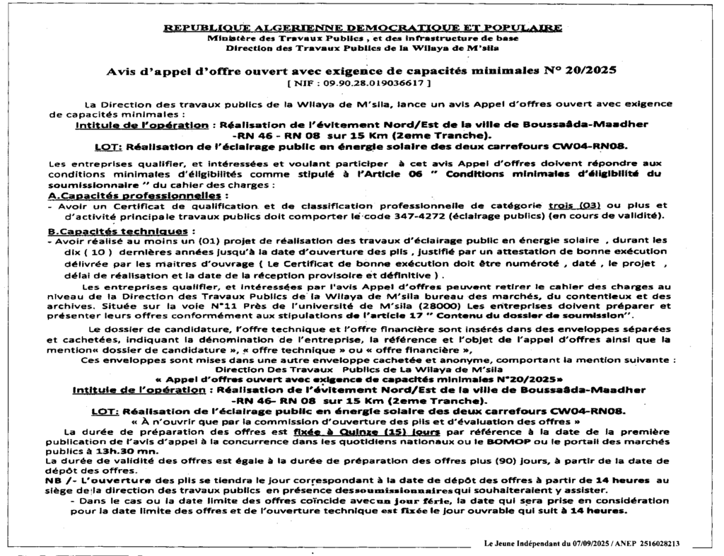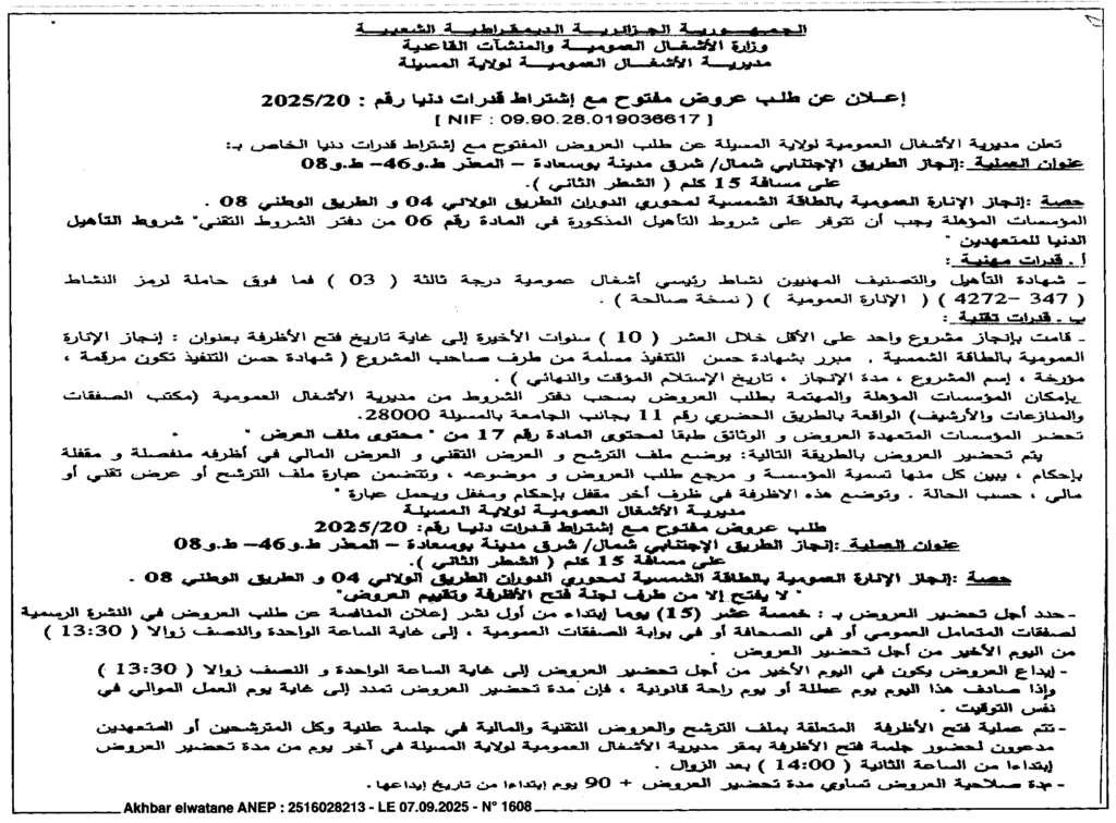 إعلان عن طلب عروض مفتوح 2025/20 مديرية الاشغال العمومية لولاية المسيلة
