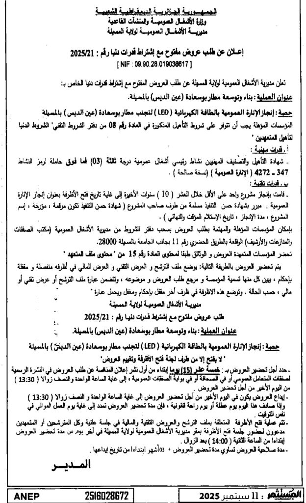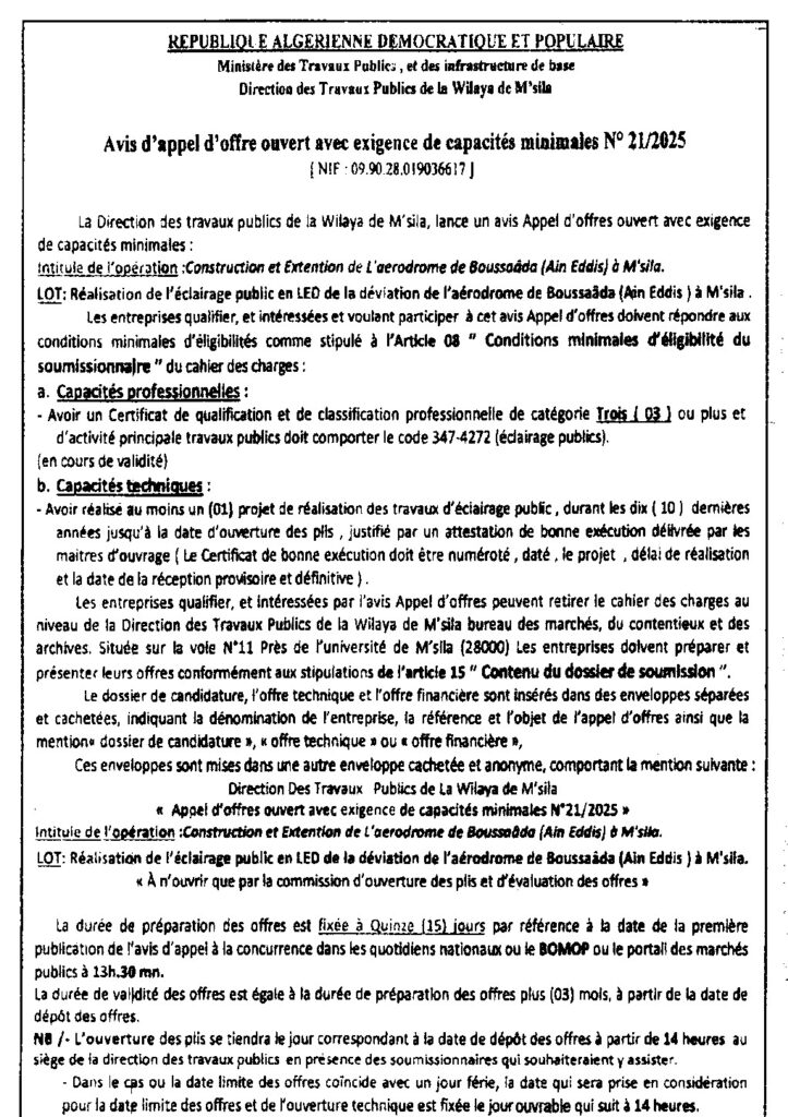 إعلان عن طلب عروض مفتوح 2025/21 مديرية الأشغال العمومية لولاية المسيلة