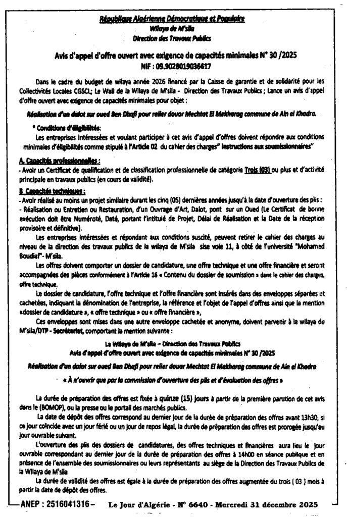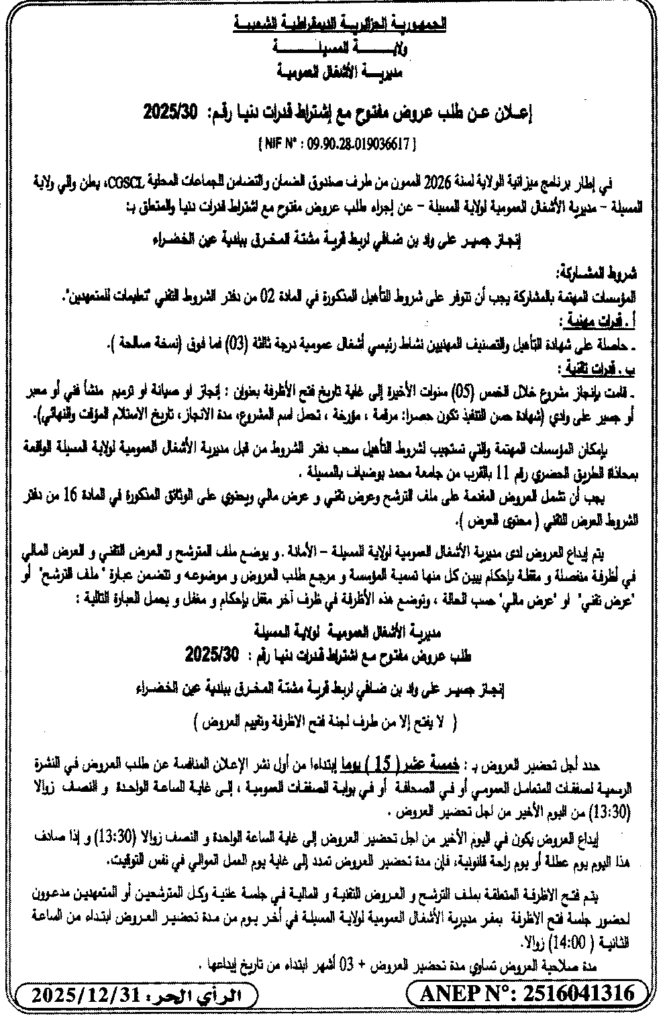 إعلان عن طلب عروض مفتوح 2025/30 مديرية الأشغال العمومية لولاية المسيلة