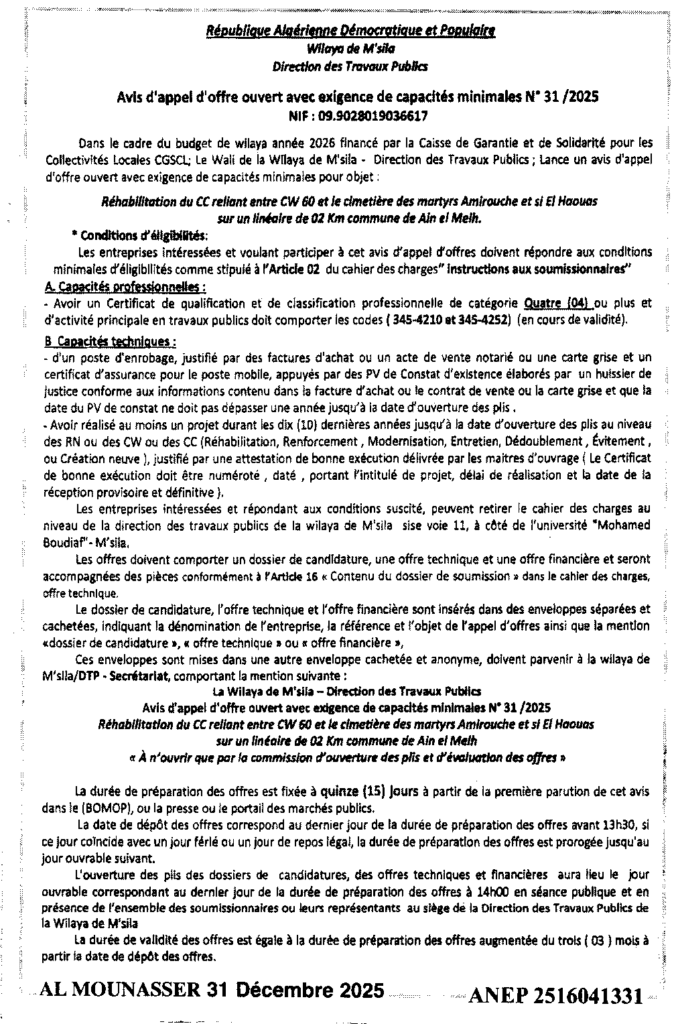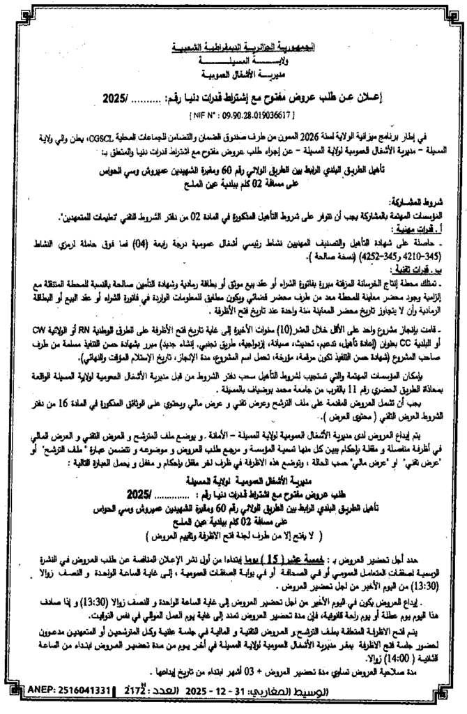 إعلان عن طلب عروض مفتوح 2025/31 مديرية الأشغال العمومية لولاية المسيلة
