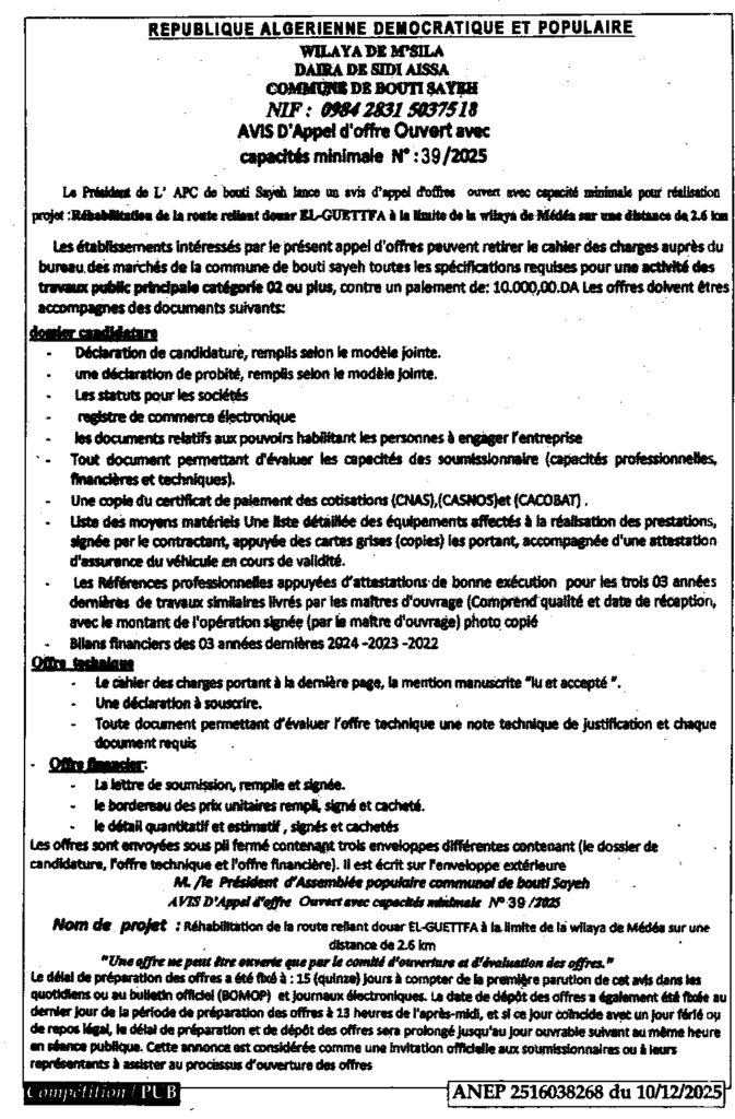 إعلان عن طلب عروض مفتوح 2025/39 بلدية بوطي السايح