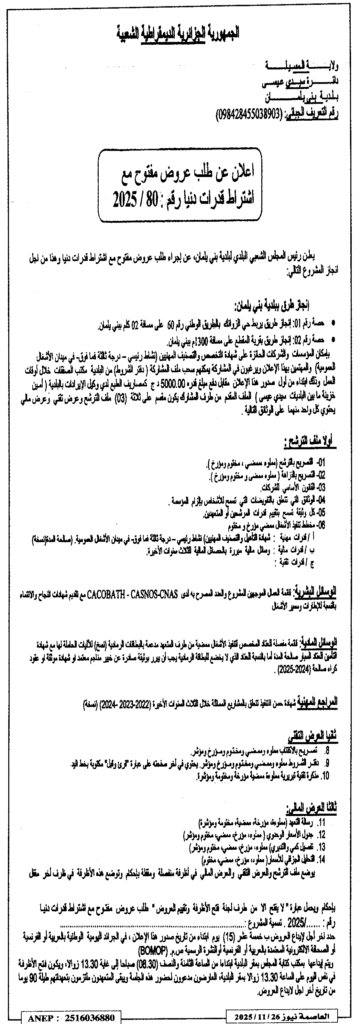 إعلان عن طلب عروض مفتوح 2025/80 بلدية بني يلمان