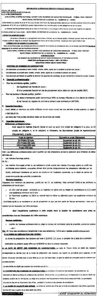 إعلان عن طلب عروض مفتوح 2025/864 مديرية التجهيزات العمومية لولاية المسيلة