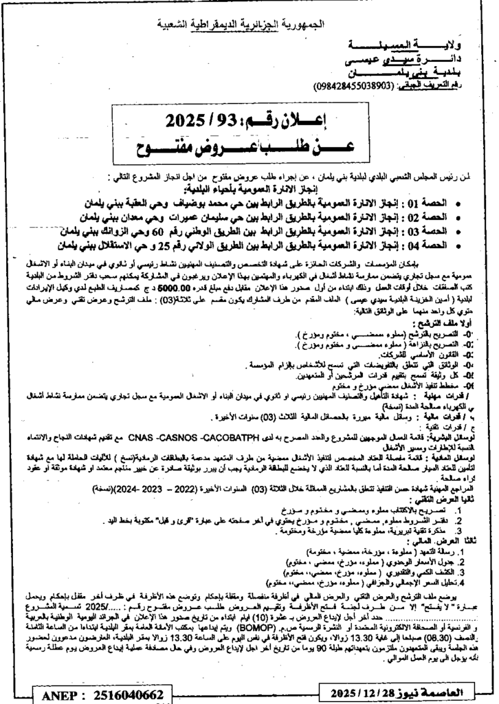 إعلان عن طلب عروض مفتوح 2025/931 بلدية بني يلمان