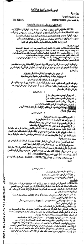 إعلان عن طلب عروض مفتوح 2025/931 مديرية التجهيزات العمومية لولاية المسيلة