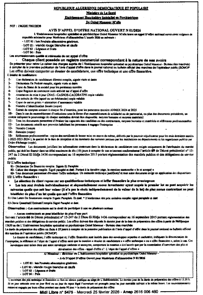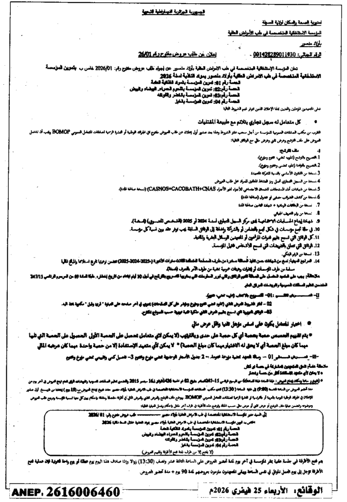 إعلان عن طلب عروض مفتوح 2026/01 المؤسسة الاستشفائية المتخصصة في طب الأمراض العقلية بأولاد منصور