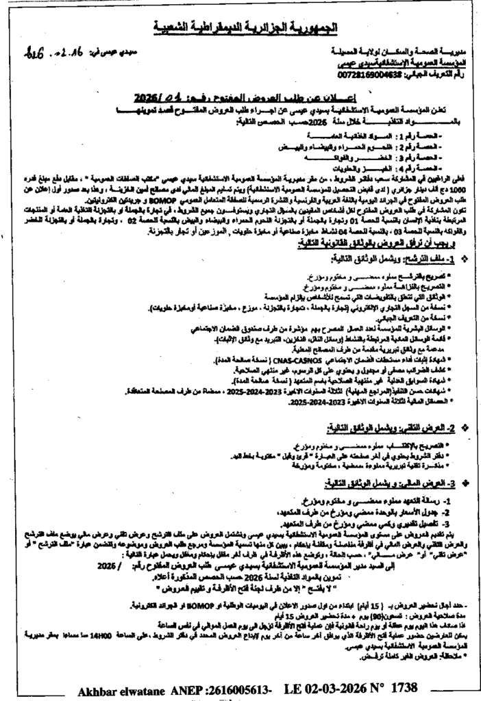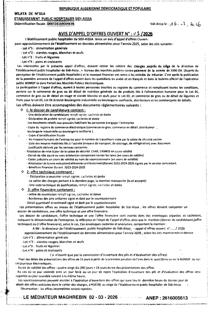 إعلان عن طلب عروض مفتوح 2026/01 المؤسسة العمومية الاستشفائية سيدي عيسى