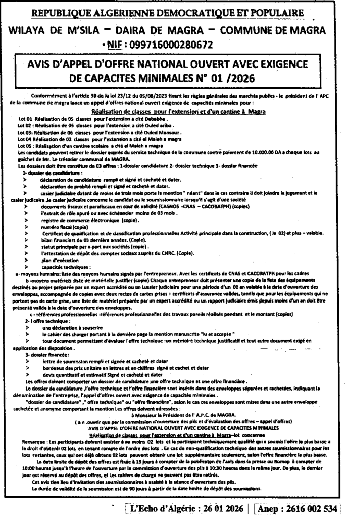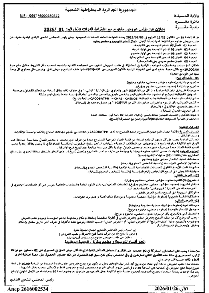 إعلان عن طلب عروض مفتوح 2026/01 بلدية مقرة