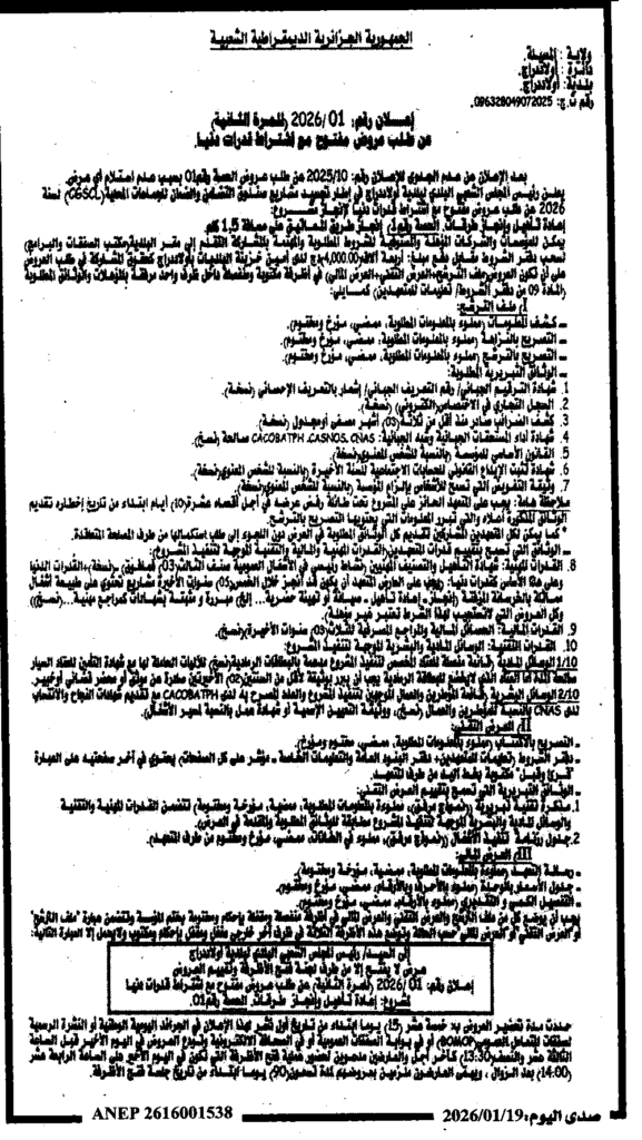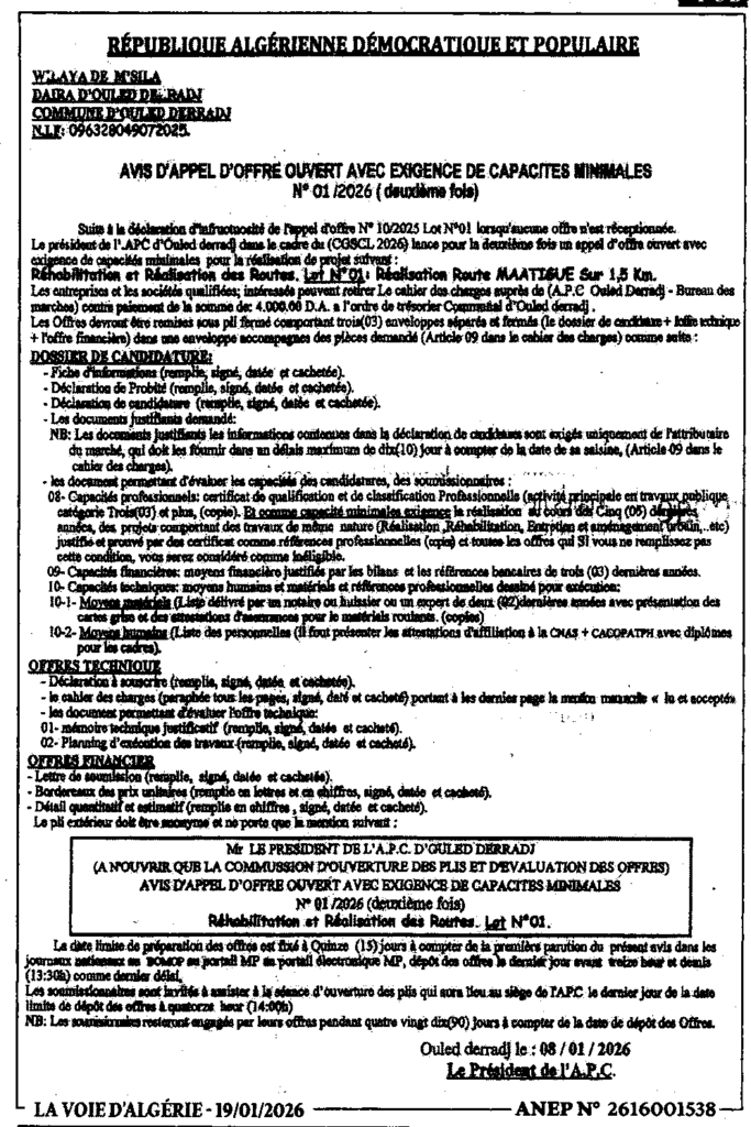إعلان عن طلب عروض مفتوح 2026/01 للمرة الثانية/ بلدية أولاد دراج