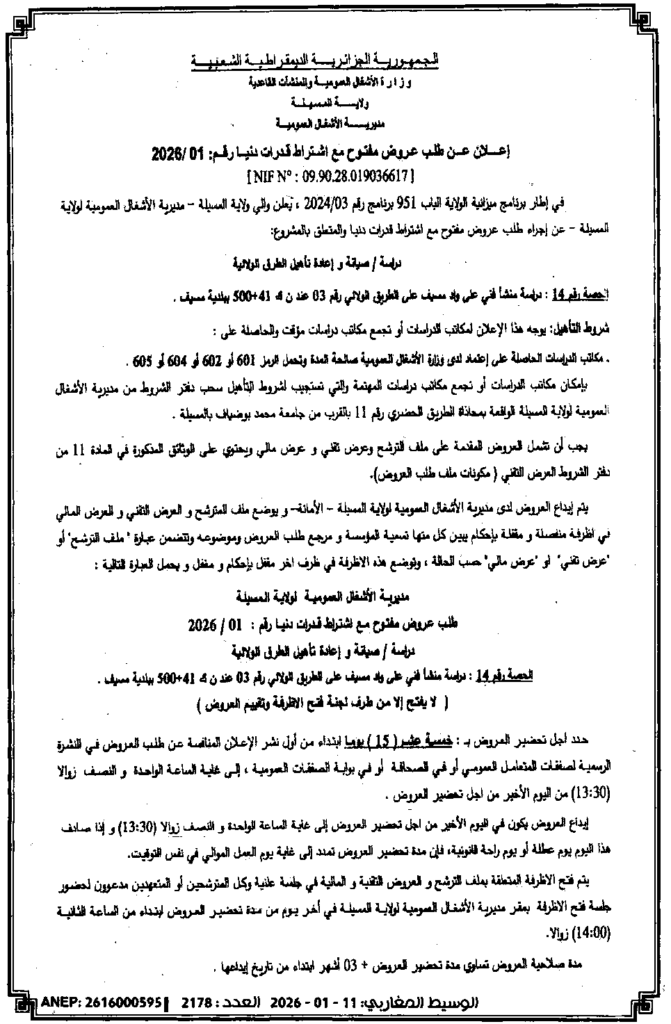 إعلان عن طلب عروض مفتوح 2026/01 مديرية الأشغال العمومية لولاية المسيلة