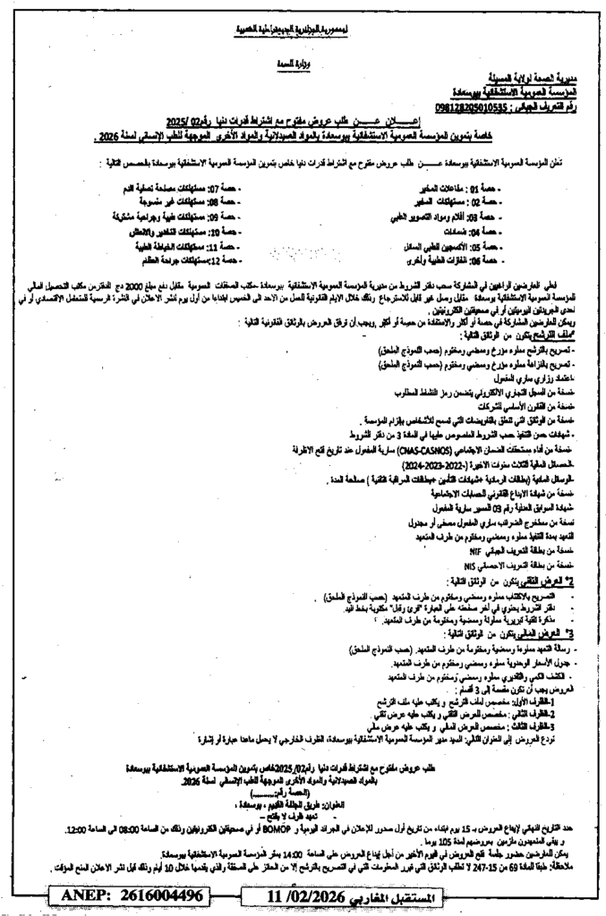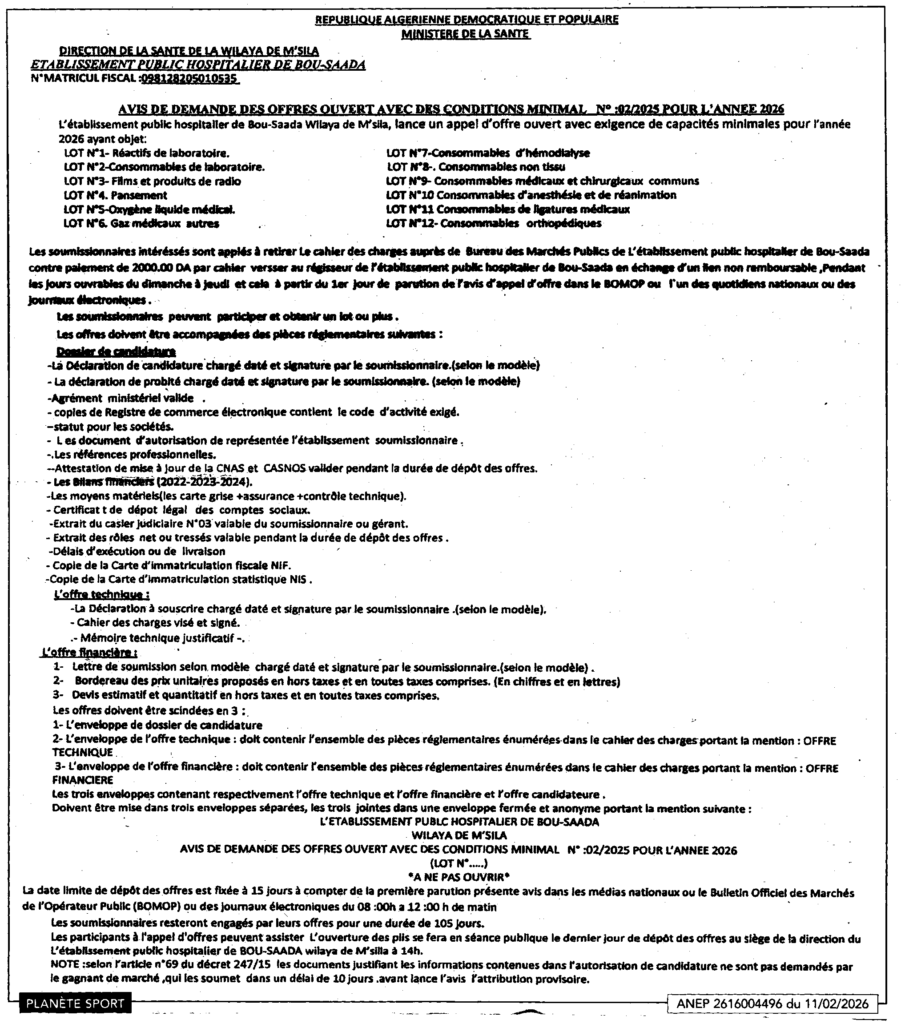 إعلان عن طلب عروض مفتوح 2026/02 المؤسسة العمومية الاستشفائية ببوسعادة
