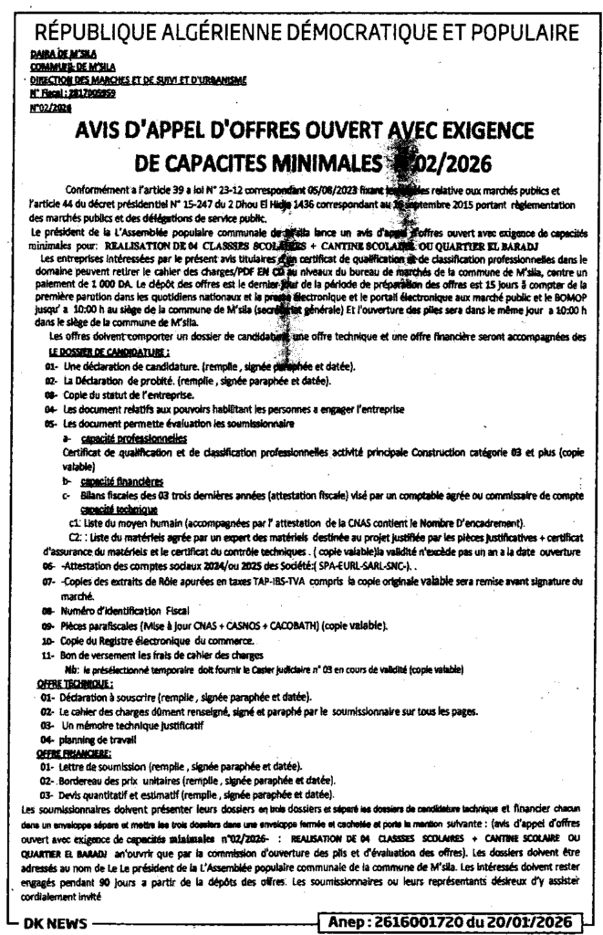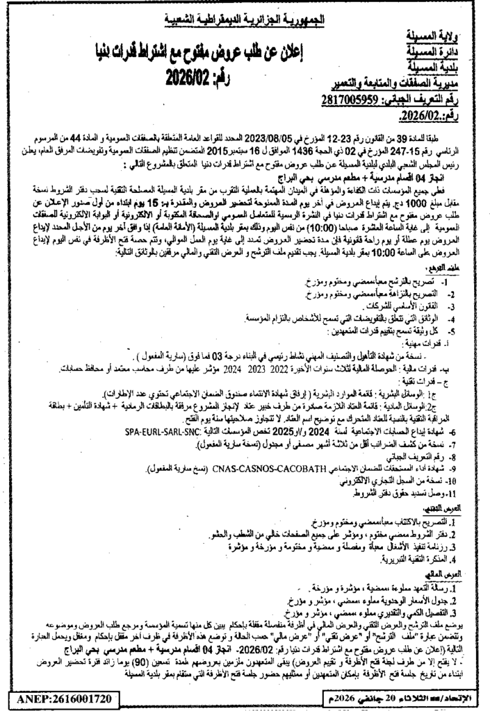 إعلان عن طلب عروض مفتوح 2026/02 بلدية المسيلة