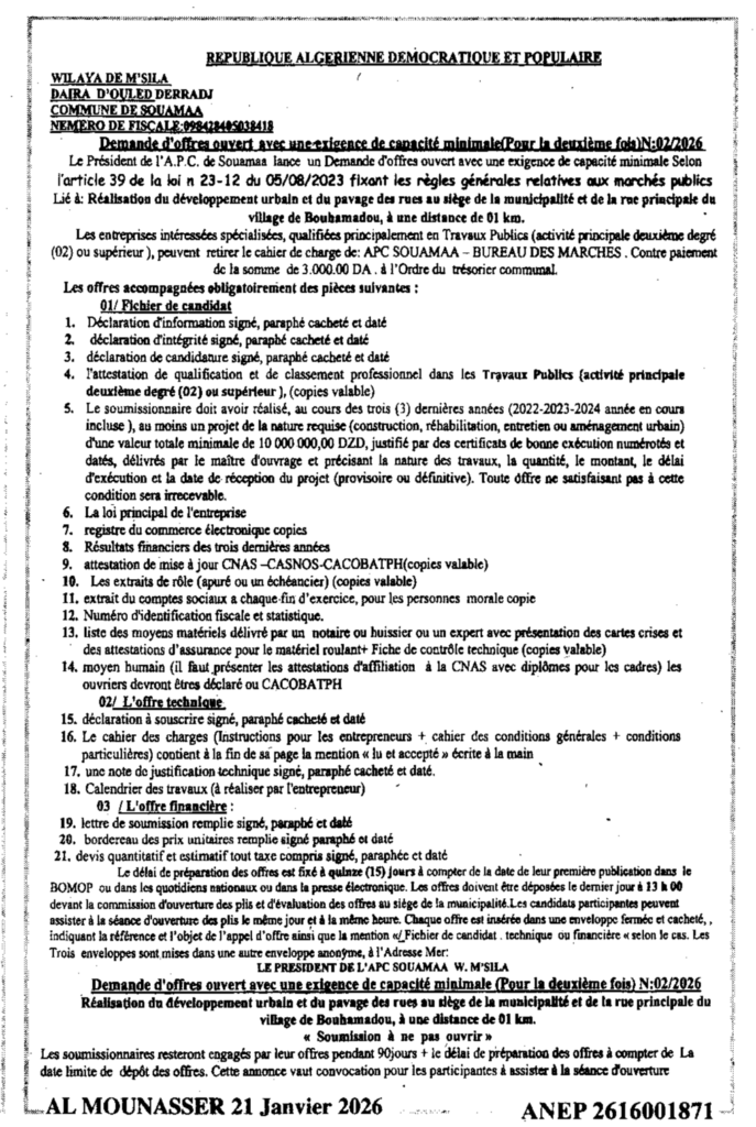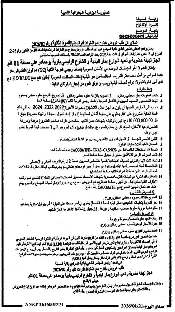 إعلان عن طلب عروض مفتوح 2026/02 للمرة الثانية/ بلدية السوامع