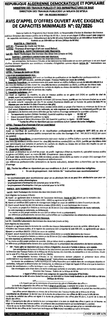 إعلان عن طلب عروض مفتوح 2026/02 مديرية الأشغال العمومية لولاية المسيلة