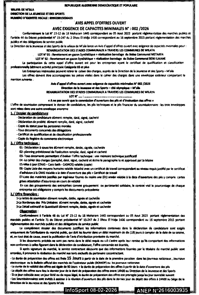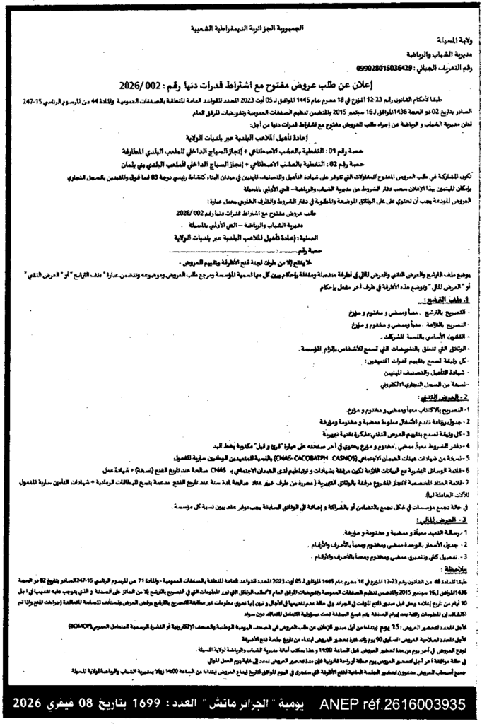 إعلان عن طلب عروض مفتوح 2026/02 مديرية الشباب والرياضة لولاية المسيلة