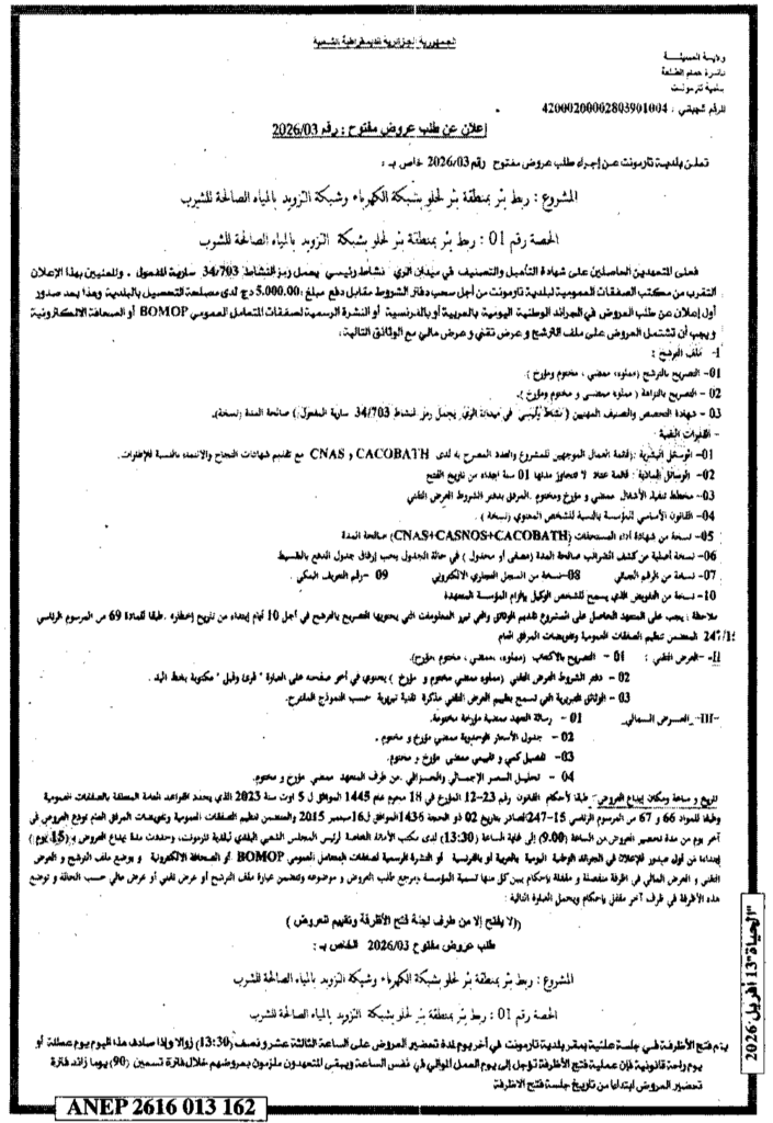 إعلان عن طلب عروض مفتوح 2026/03 بلدية تارمونت