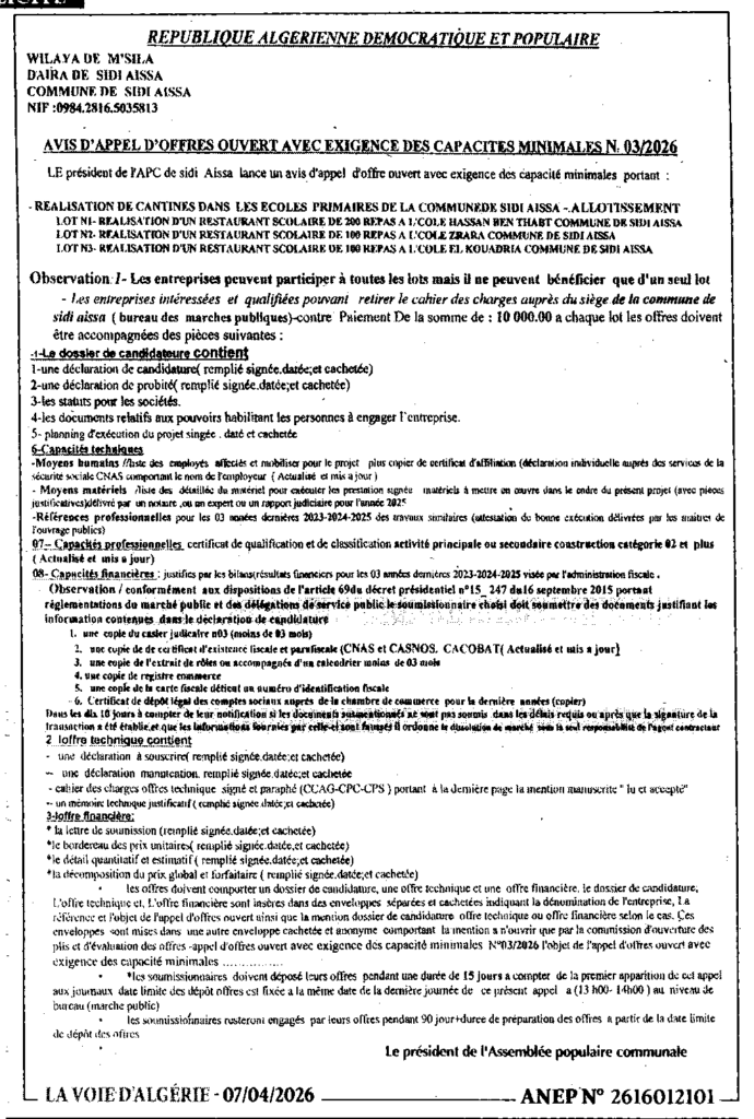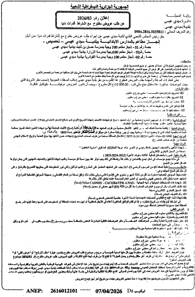 إعلان عن طلب عروض مفتوح 2026/03 بلدية سيدي عيسى