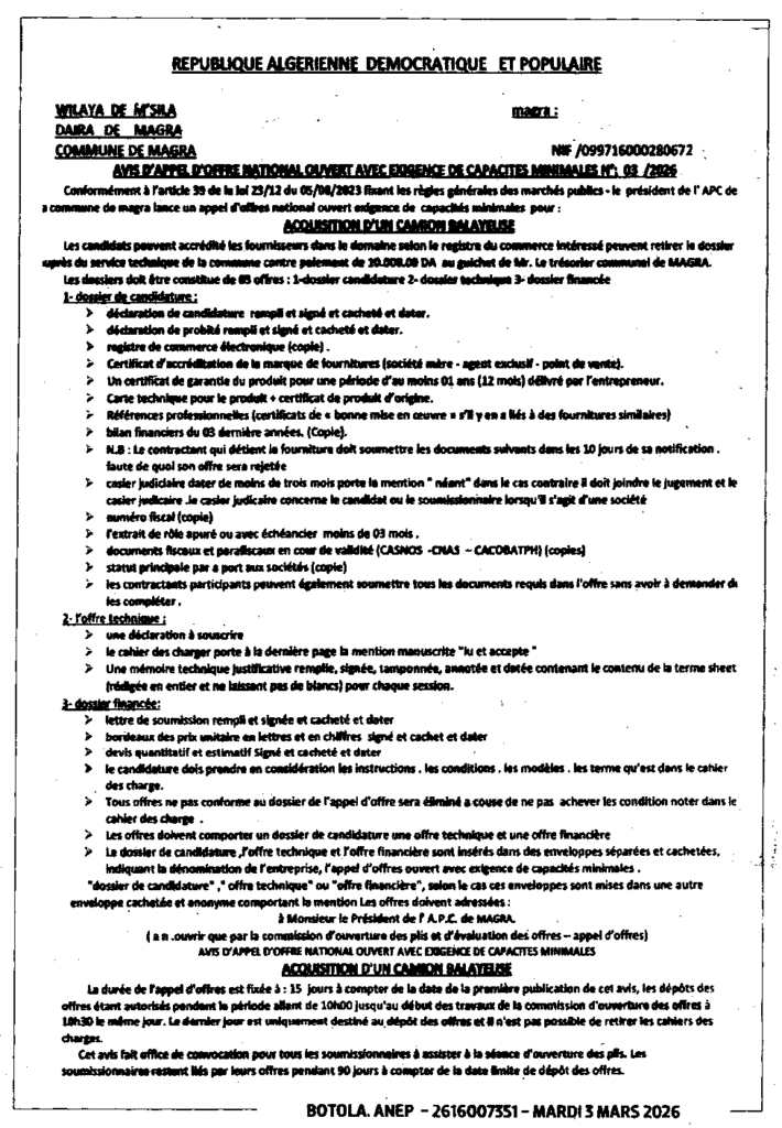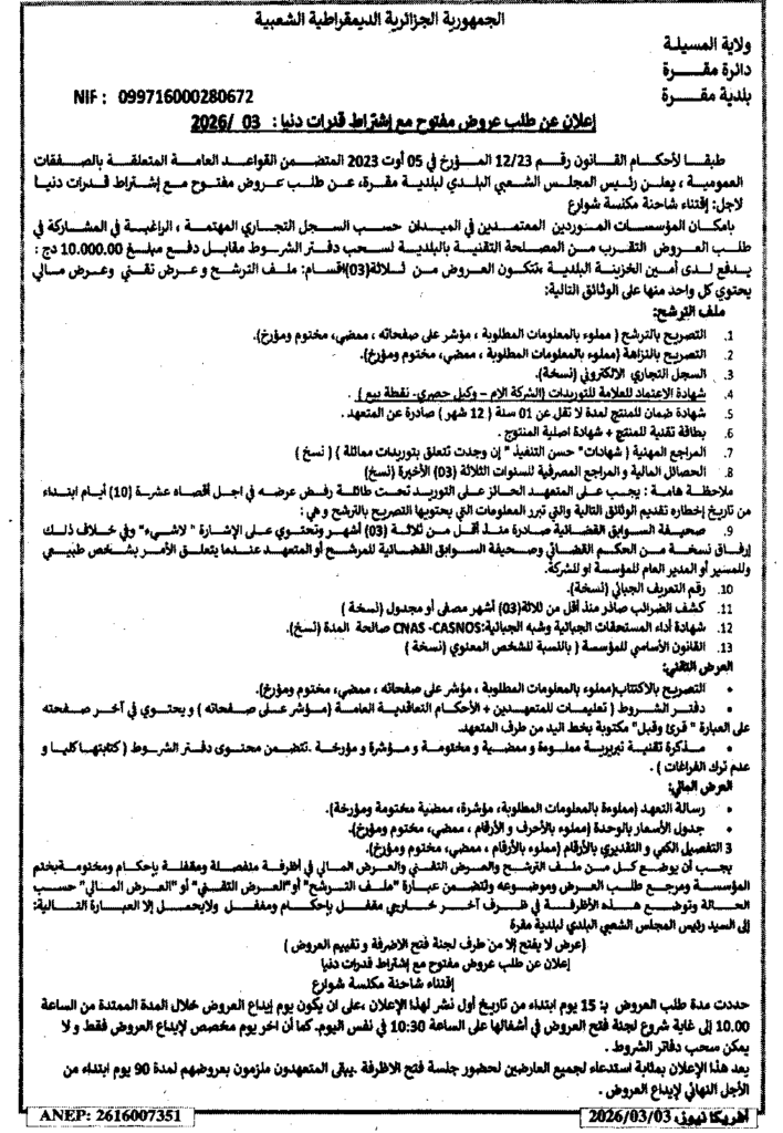 إعلان عن طلب عروض مفتوح 2026/03 بلدية مقرة