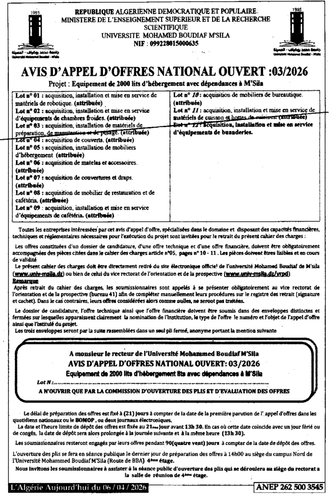 إعلان عن طلب عروض مفتوح 2026/03 جامعة محمد بوضياف بالمسيلة