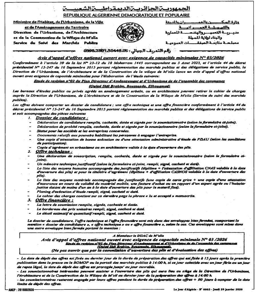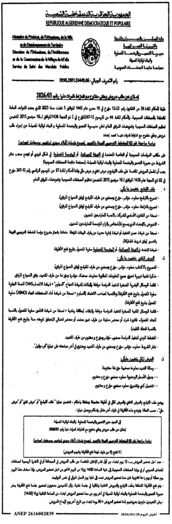 إعلان عن طلب عروض مفتوح 2026/03 مديرية التعمير والهندسة المعمارية والبناء لولاية المسيلة