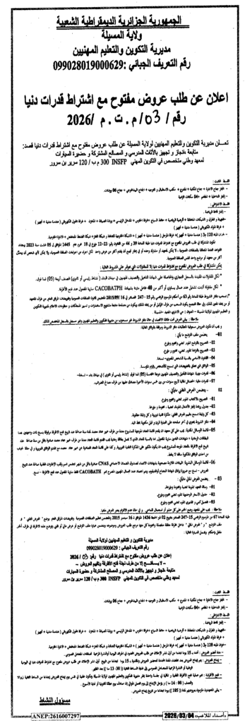 إعلان عن طلب عروض مفتوح 2026/03 مديرية التكوين والتعليم المهنيين لولاية المسيلة