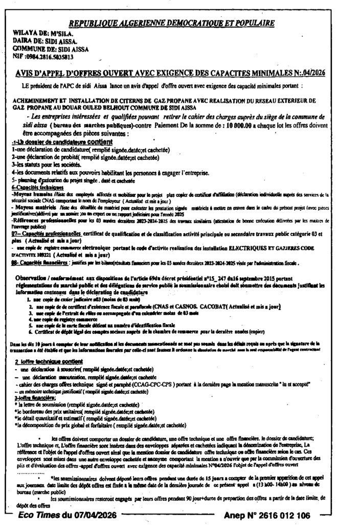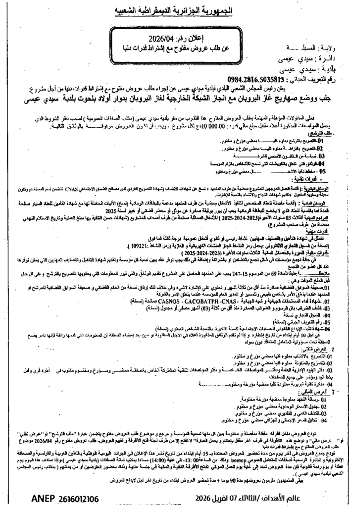إعلان عن طلب عروض مفتوح 2026/04 بلدية سيدي عيسى