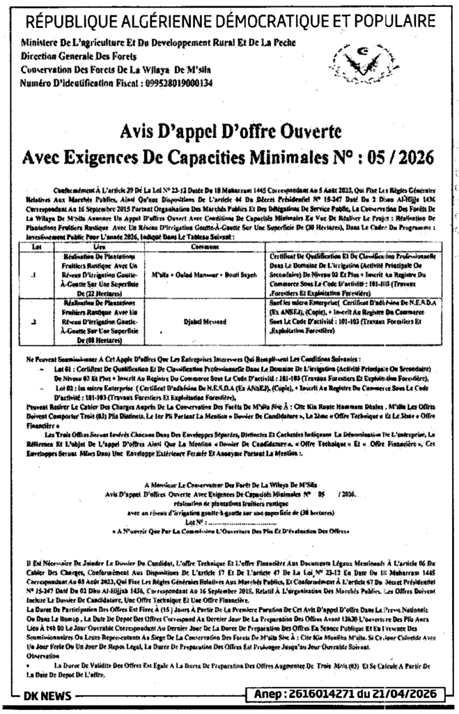 إعلان عن طلب عروض مفتوح 2026/05 محافضة الغابات لولاية المسيلة