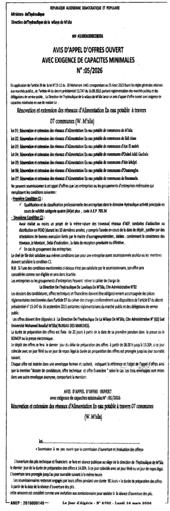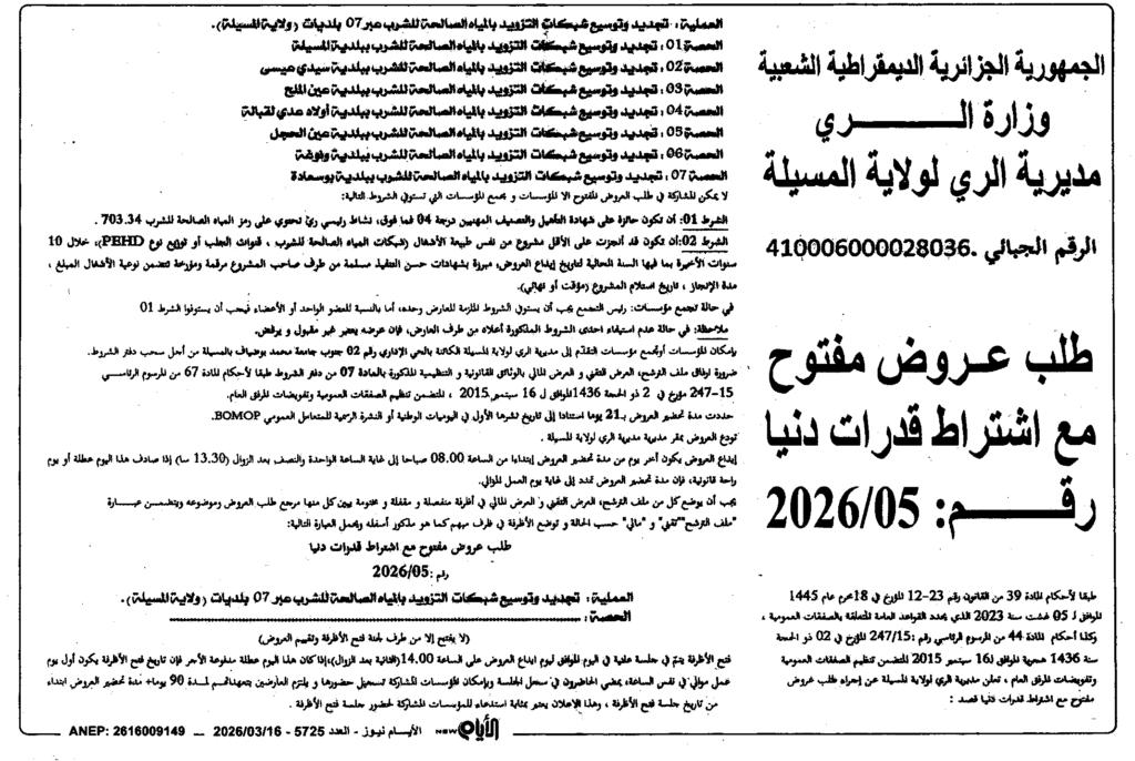 إعلان عن طلب عروض مفتوح 2026/05 مديرية الري لولاية المسيلة