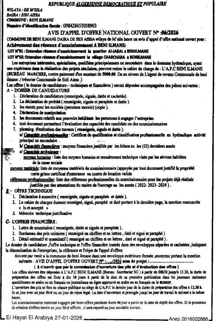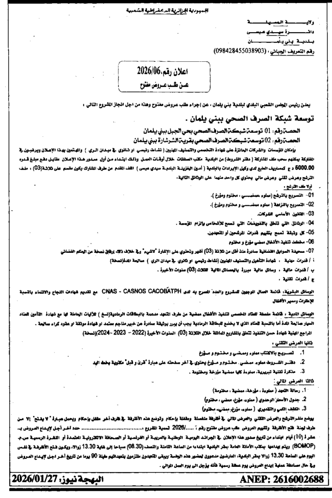 إعلان عن طلب عروض مفتوح 2026/06 بلدية بني يلمان