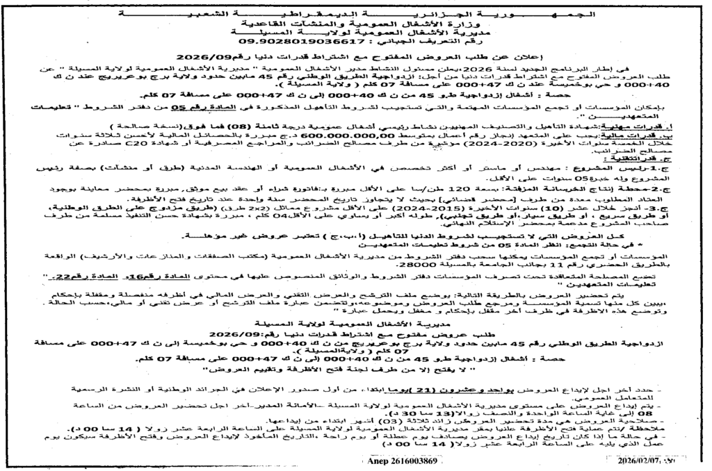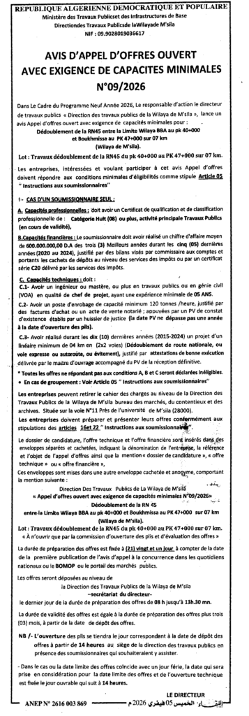 إعلان عن طلب عروض مفتوح 2026/09 مديرية الأشغال العمومية لولاية المسيلة