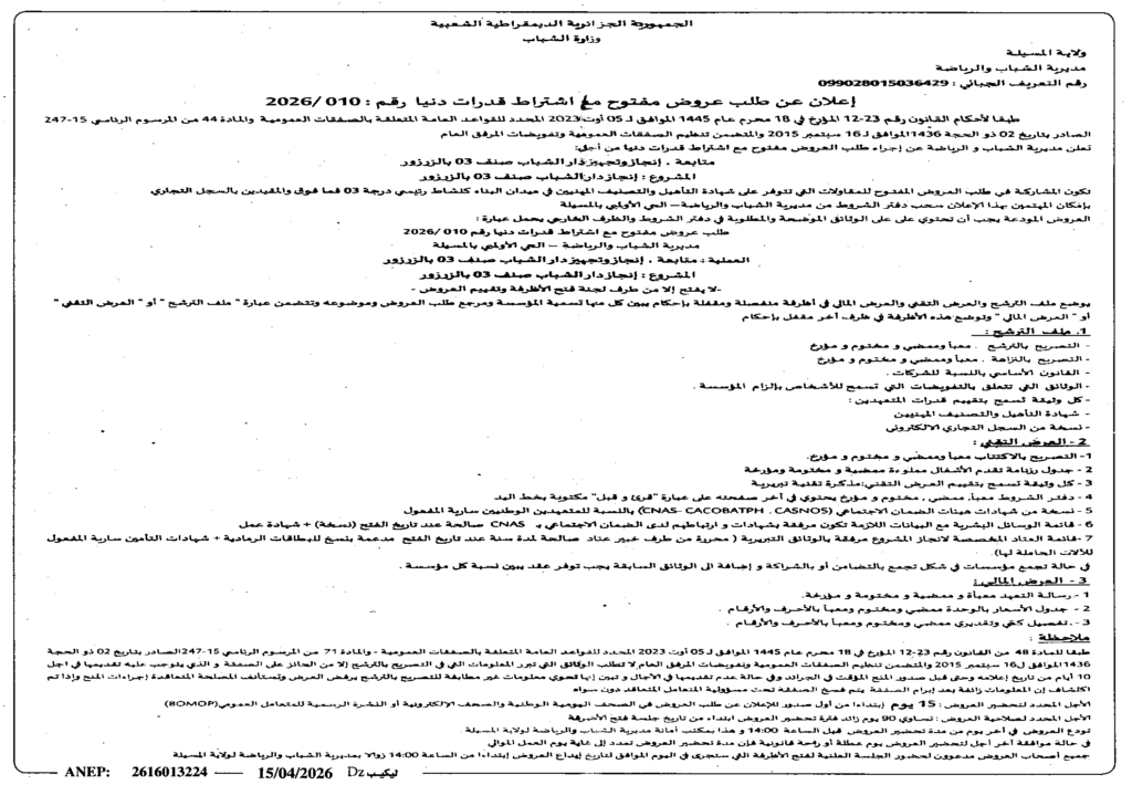 إعلان عن طلب عروض مفتوح 2026/10 مديرية الشباب والرياضة لولاية المسيلة