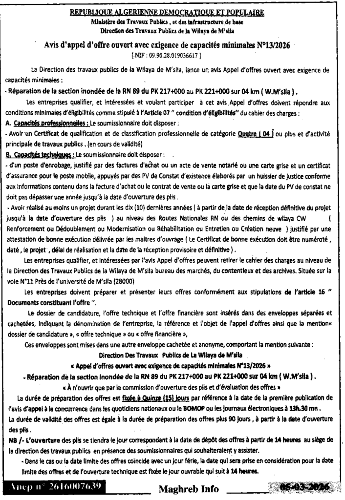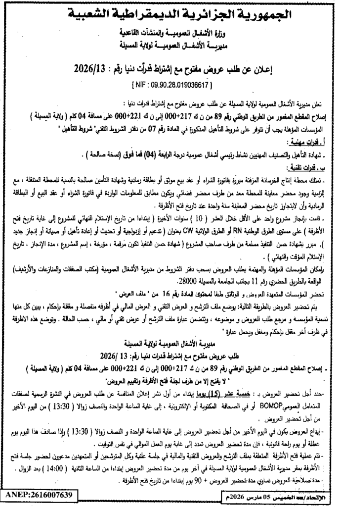 إعلان عن طلب عروض مفتوح 2026/13 مديرية الأشغال العمومية لولاية المسيلة