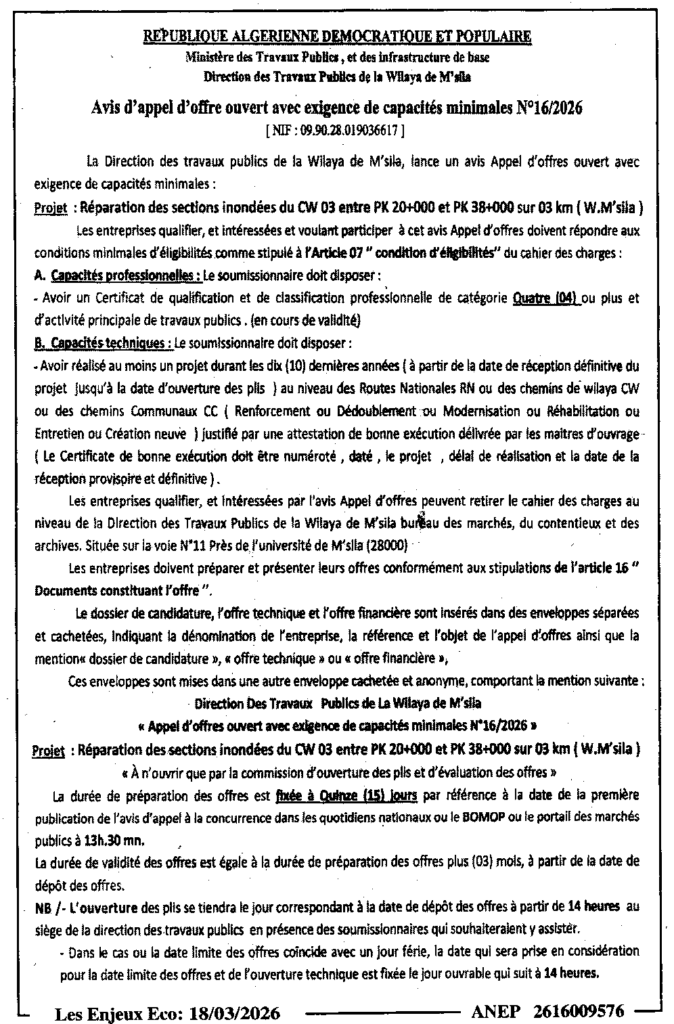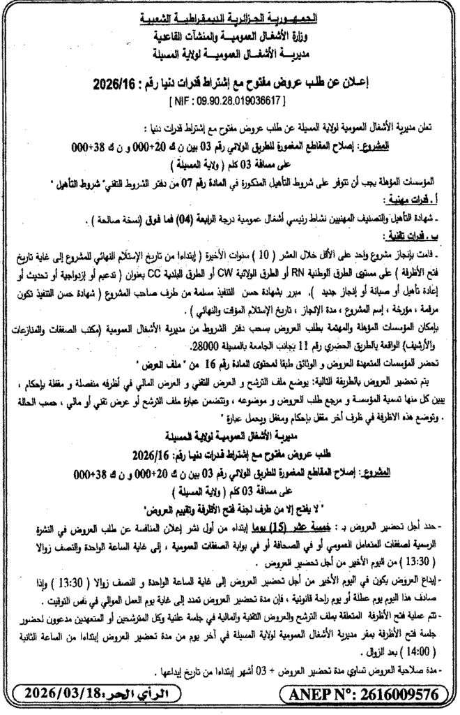 إعلان عن طلب عروض مفتوح 2026/16 مديرية الأشغال العمومية لولاية المسيلة