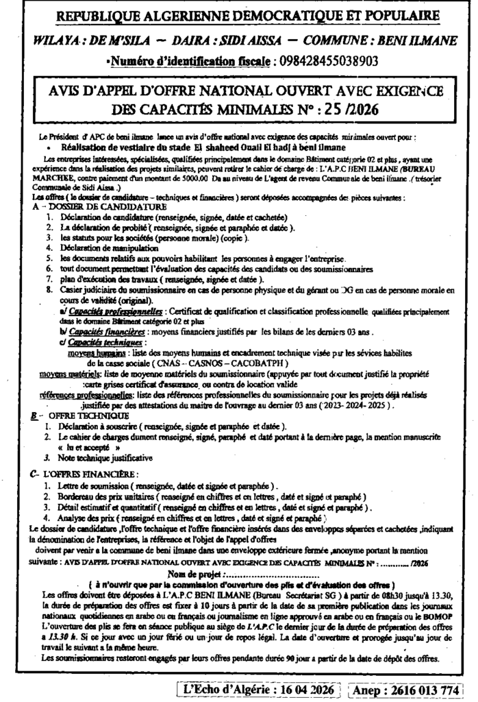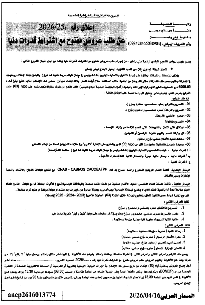 إعلان عن طلب عروض مفتوح 2026/25 بلدية بني يلمان