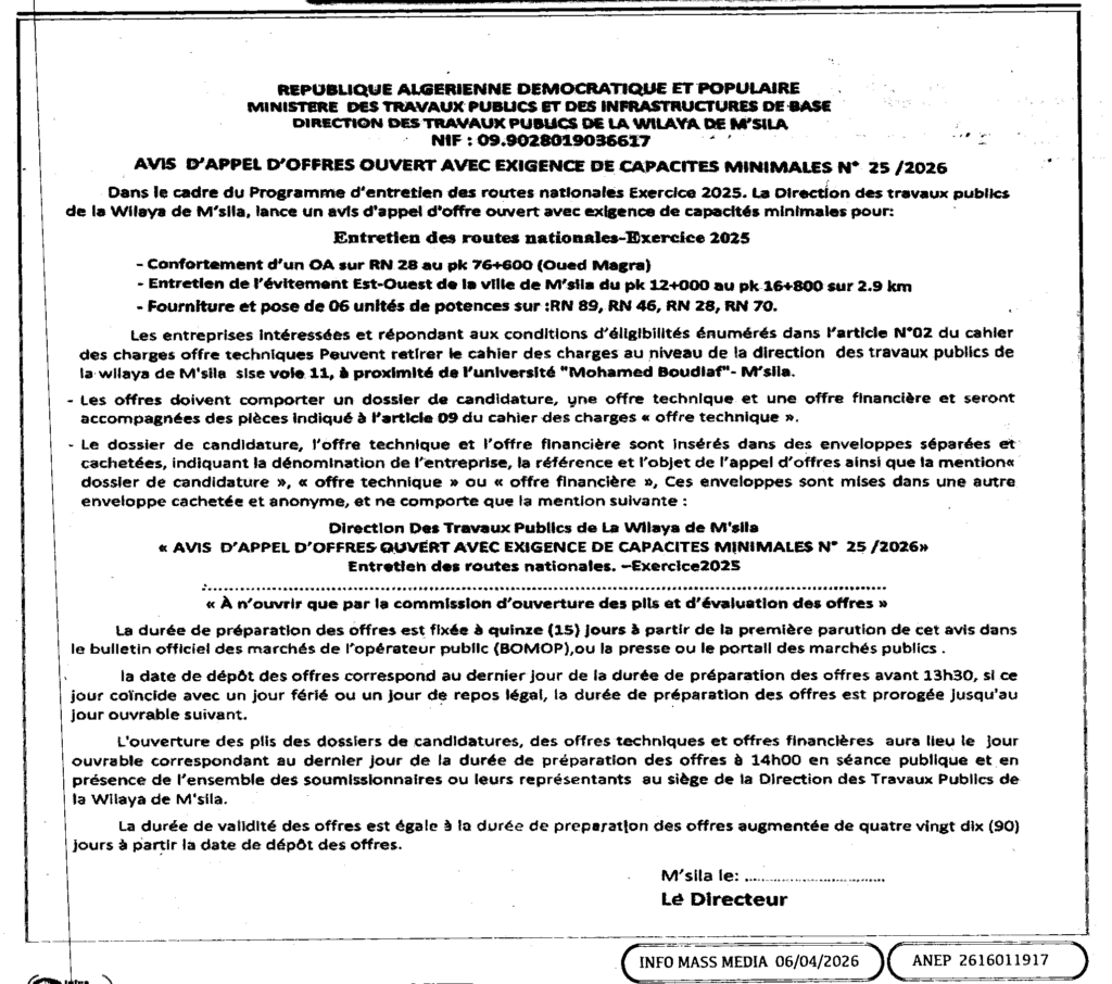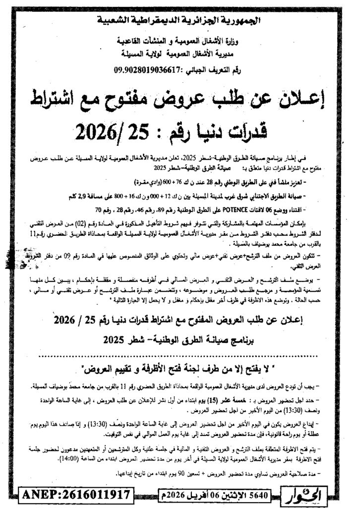 إعلان عن طلب عروض مفتوح 2026/25 مديرية الأشغال العمومية لولاية المسيلة