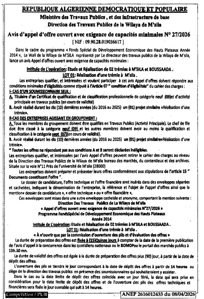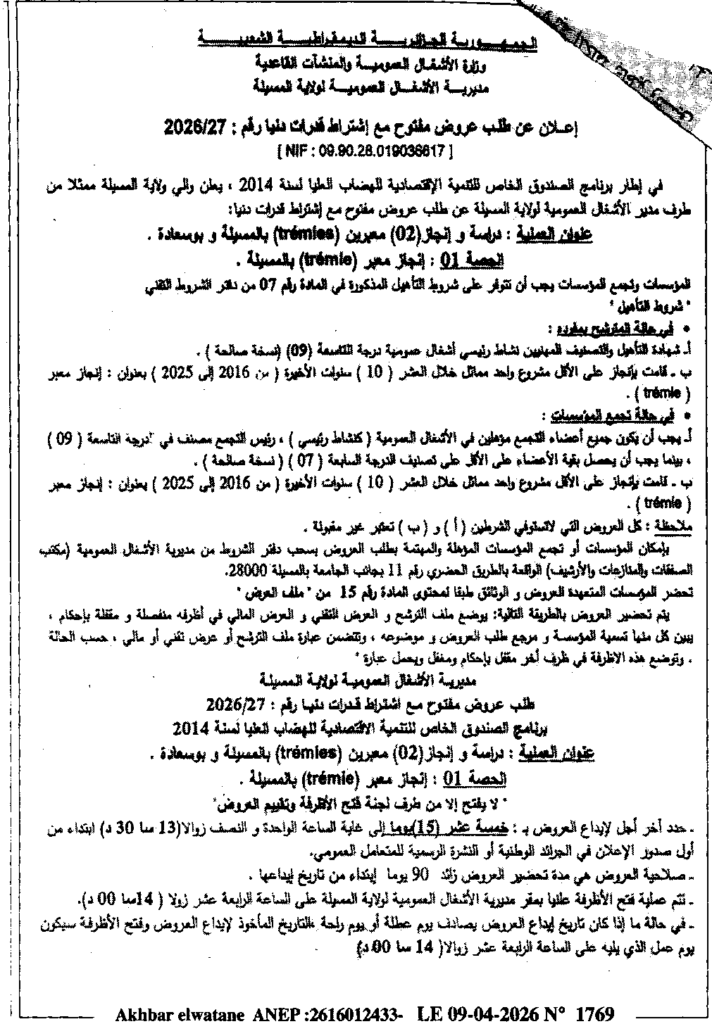 إعلان عن طلب عروض مفتوح 2026/27 مديرية الأشغال العمومية لولاية المسيلة