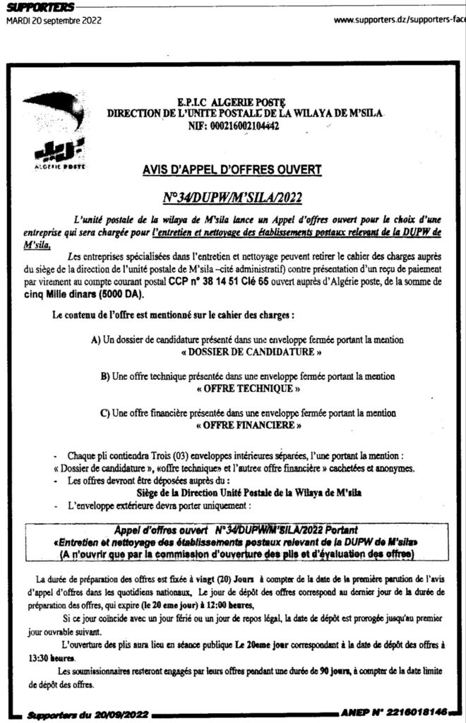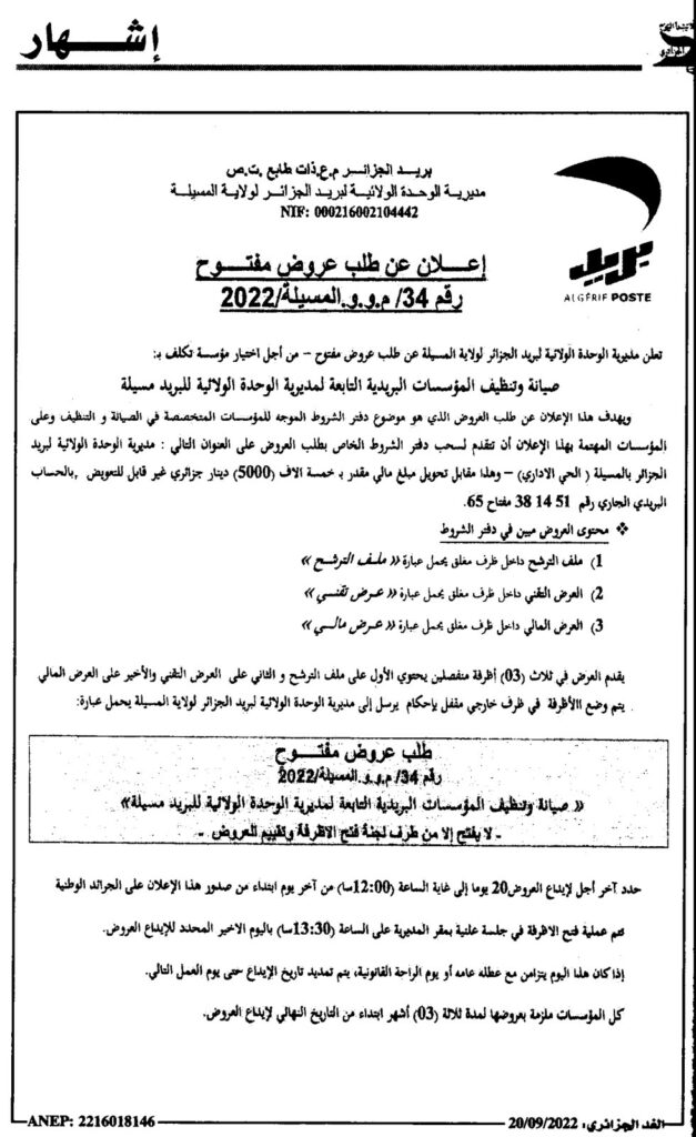طلب عروض مفتوح من أجل اختيار مؤسسة تكلف بـ : صيانة وتنظيف المؤسسات البريدية التابعة لمديرية الوحدة الولائية للبريد مسيلة20 سبتمبر، 20220 33 شاركها فيسبوك X مشاركة عبر البريد طباعة