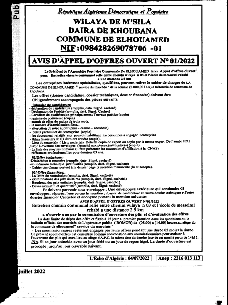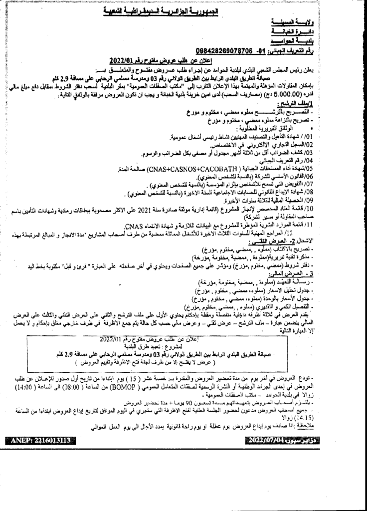 إعلان عن طلب عروض مفتوح: صيانة الطريق البلدي الرابط بين الطريق الولائي رقم 03 ومدرسة مسلمي الرحابي على مسافة 2.9 كلم بلدية الحوامد