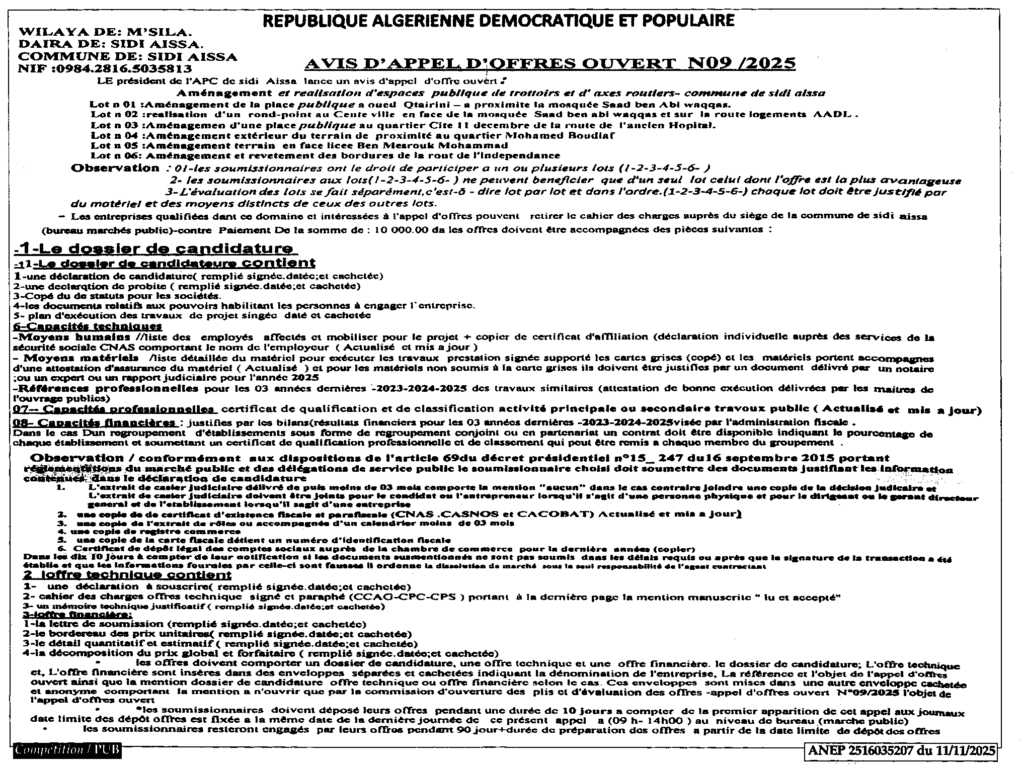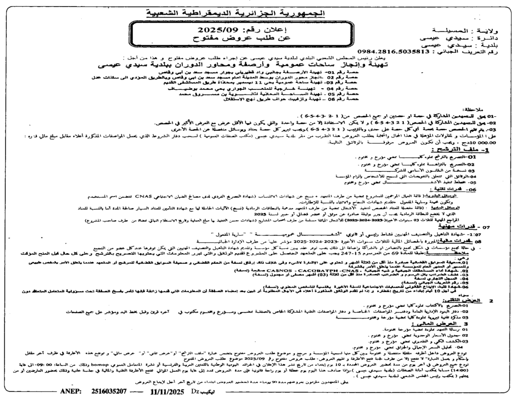إعلان عن طلب عروض مفوح 2025/09 بلدية سيدي عيسى