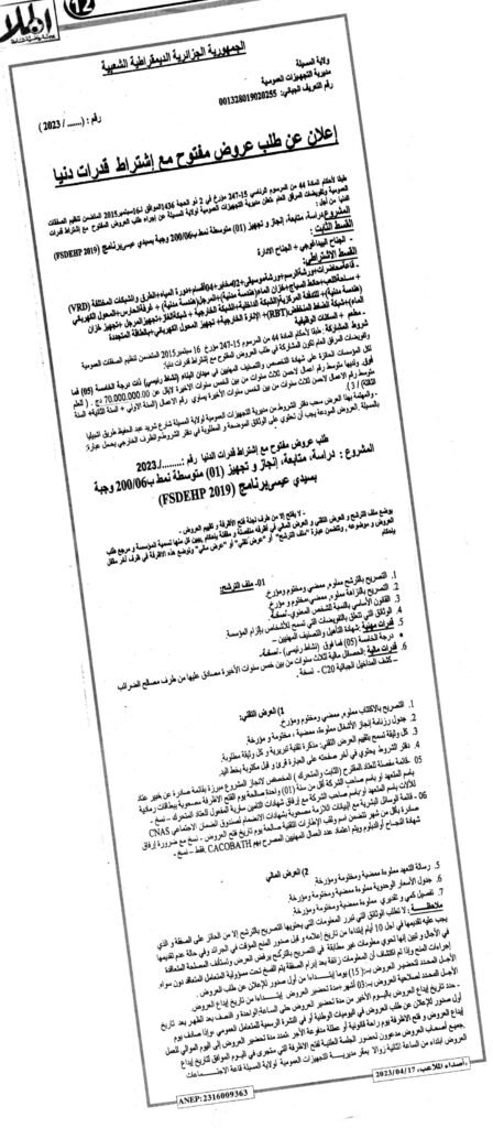 إعلان عن طلب عروض مقتوح: دراسة، متابعة، إنجاز وتجهيز متوسطة نمط ب 200/06 وجبة بسيدي عيسى مديرية التجهيزات العمومية لولاية المسيلة